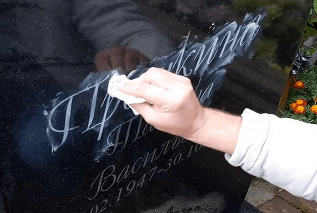 Всем известно, что натуральный камень впитывает влагу на не полированных поверхностях, поэтому гравировка становится темнее. Для того чтобы гравировка была ярче используют нанесение определенной краски.